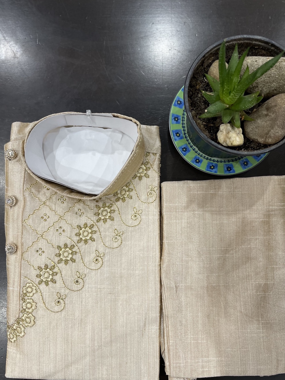 Readymade Dupion silk Kurta pyjama Angrakha style in Golden colour with Golden pyjama